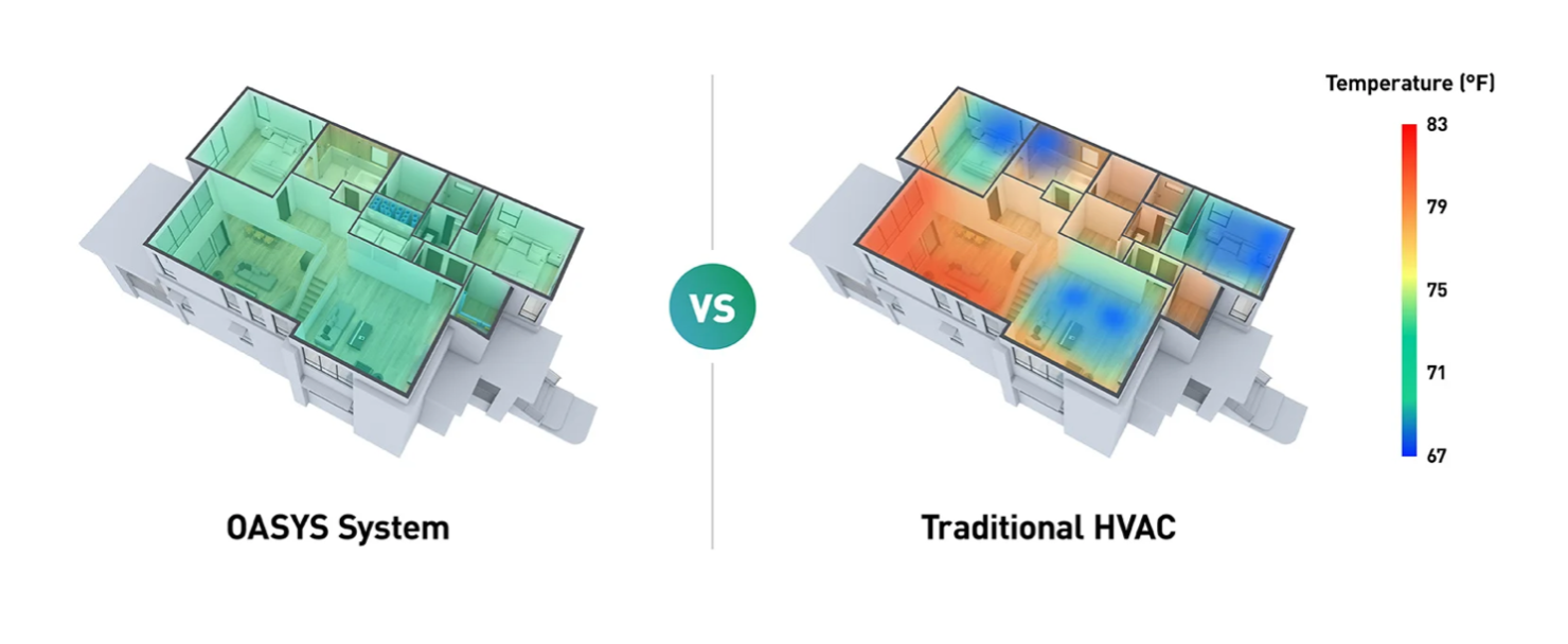 That room-to-room consistency comes from OASYS’s low-velocity, continuous air circulation design. Instead of relying on a single large blower that pushes bursts of air into certain zones, OASYS uses multiple small, high-efficiency fans to keep air moving gently and evenly throughout the home. This steady airflow helps eliminate hot and cold spots, balances humidity across rooms, and creates a comfort level that feels natural rather than forced.
