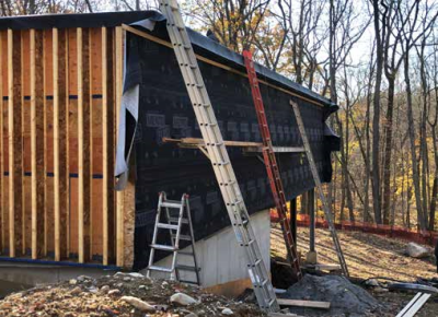 • Walls: 2x6, 16" o.c.+ Larsen truss, R-62 total: 2x6 studs with 5.5" dense-packed cellulose, 1/2" plywood sheathing with joints taped, 12" I-joists at 16" o.c. dense-packed with cellulose, held in place by heavy breathable membrane, ¾" furring strips, 1x4 horizontal cedar siding.