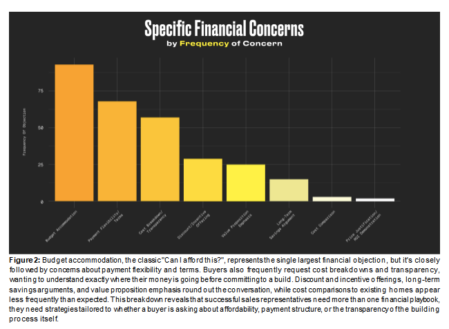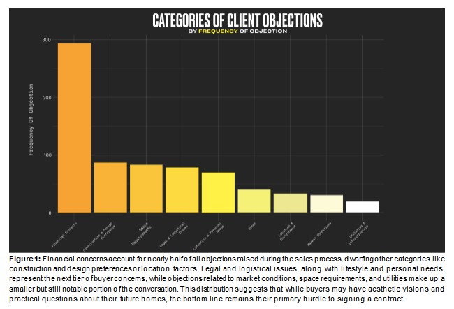 This exploratory analysis is intended to illuminate trends and patterns that emerged from real conversations. The following findings offer a data-informed look at the home building sales landscape, providing insights that can help representatives better understand their clients' perspectives and refine their approach to objection handling.