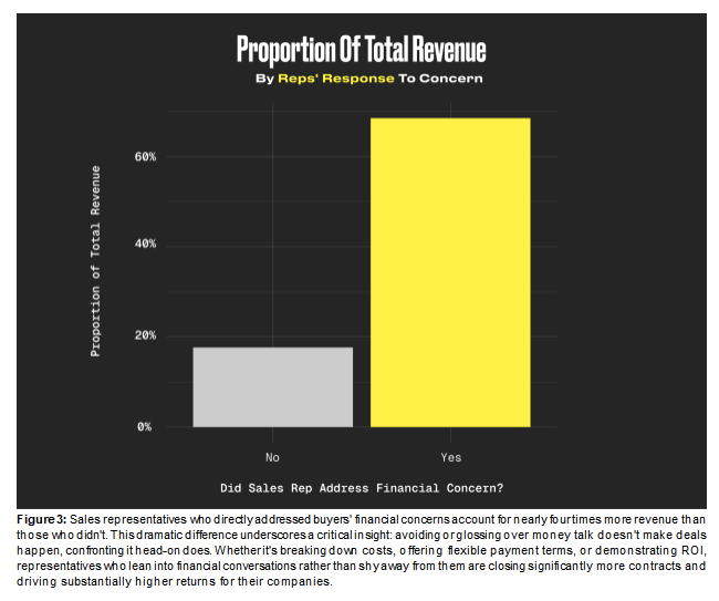 To further expand on the financial concern category and to compare between appointments where sales reps effectively addressed the client’s concerns and appointments where reps failed to address concerns, we looked at the total revenue generated by each approach. In 2025, we determined that when the financial concern was addressed the total revenue generated was $14.3 million, while not addressing the client’s financial concern resulted in just $3.7 million. This indicates that reps who addressed the client’s financial concern generated 4x more revenue for the year than reps who failed to do this (see Figure 3).